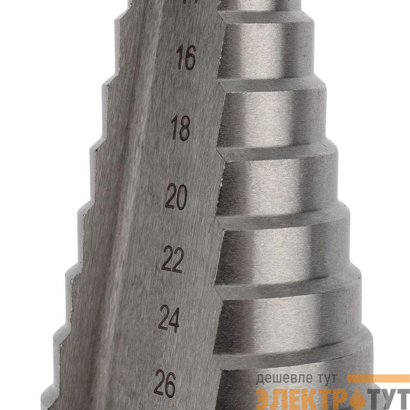 На каждой из 15 ступеней сверла нанесена маркировка фактического диаметра. Диапазон ступеней: 4, 6, 8, 10, 12, 14, 16, 18, 20, 22, 24, 26, 28, 30, 32 (шаг 2 мм).