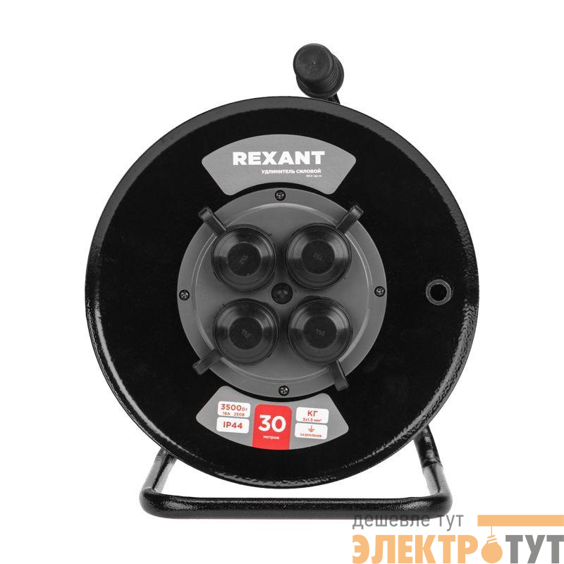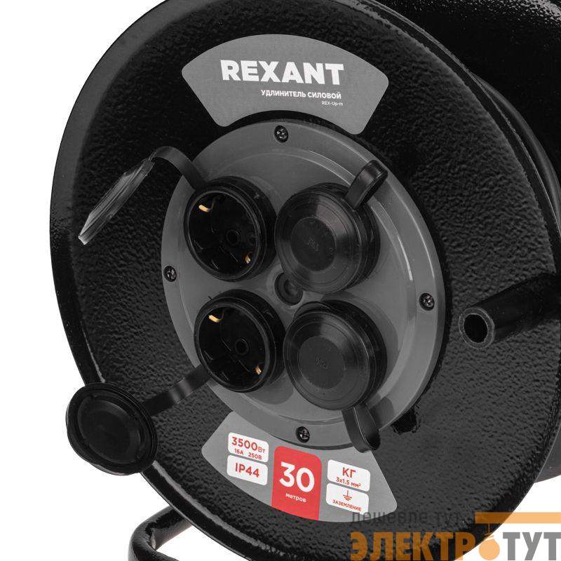 13-5011 | Удлинитель на метал. катушке 4х30м с заземл. IP44 КГ 3х1.5кв.мм c защ. крышкой Rexant