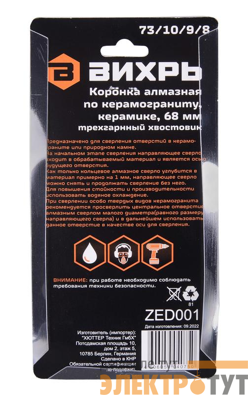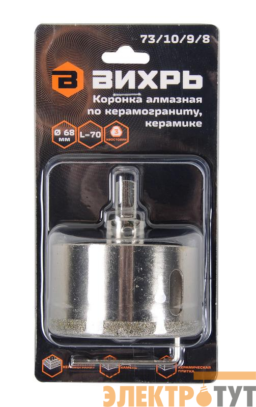 73/10/9/8 | Коронка алмазная по керамограниту/керамике 68мм Вихрь