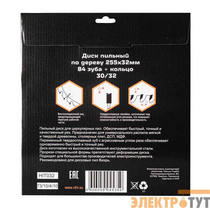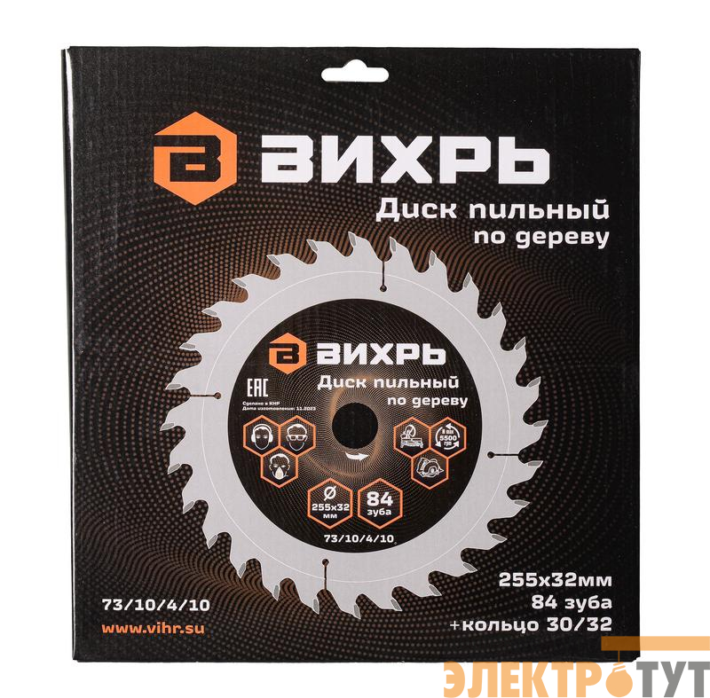 73/10/4/10 | Диск пильный по дереву 255х32мм 84зуб. + кольцо 30/32 Вихрь