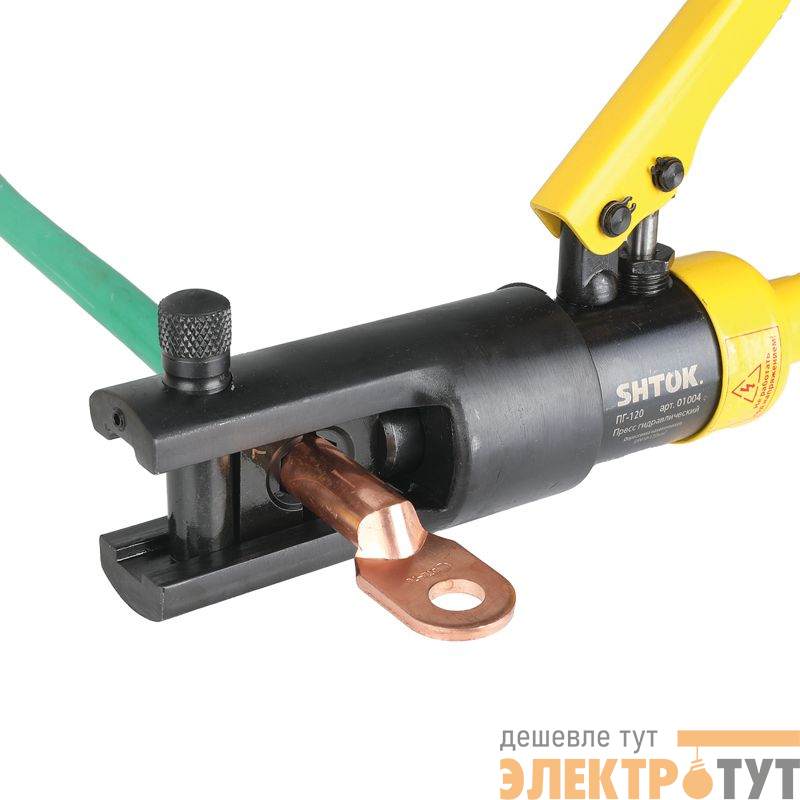 Особая конструкция ручного гидравлического пресса SHTOK ПГ-120 01004 плотно зажимает кабель, не давая ему ""выйти"" из рабочей области. Минимальная площадь опрессовки 10 мм.