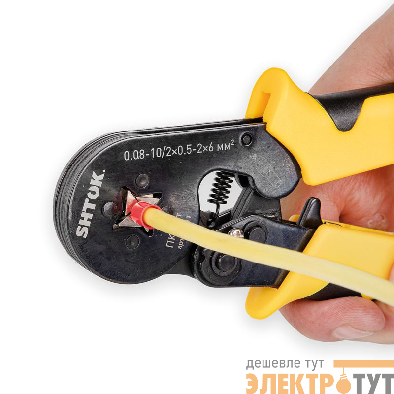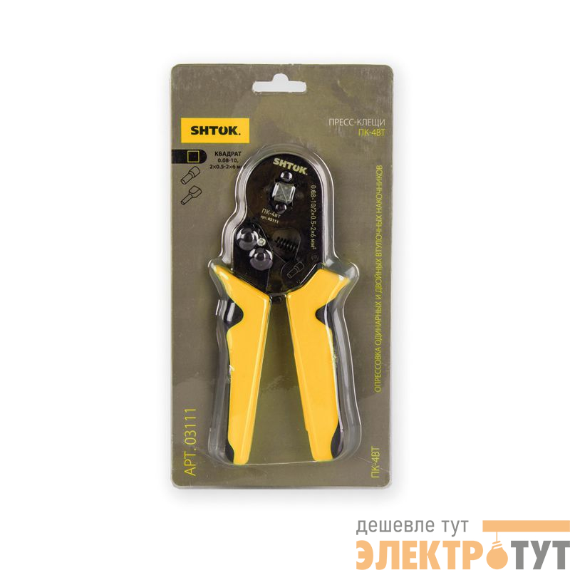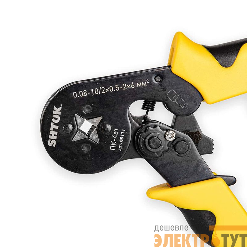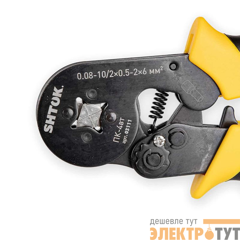 Ручные пресс-клещи SHTOK ПК-4вт 03111 производят опрессовку квадратом. Прочная конструкция надежно фиксирует кабель, обеспечивая опрессовку в одно касание. Инструмент предназначен для работы с одинарными и двойными втулочными наконечниками. Диапазон сечений: НШВИ2 2х0.5 - 2х6 мм2, НШВИ 0.08 - 10 мм2.
