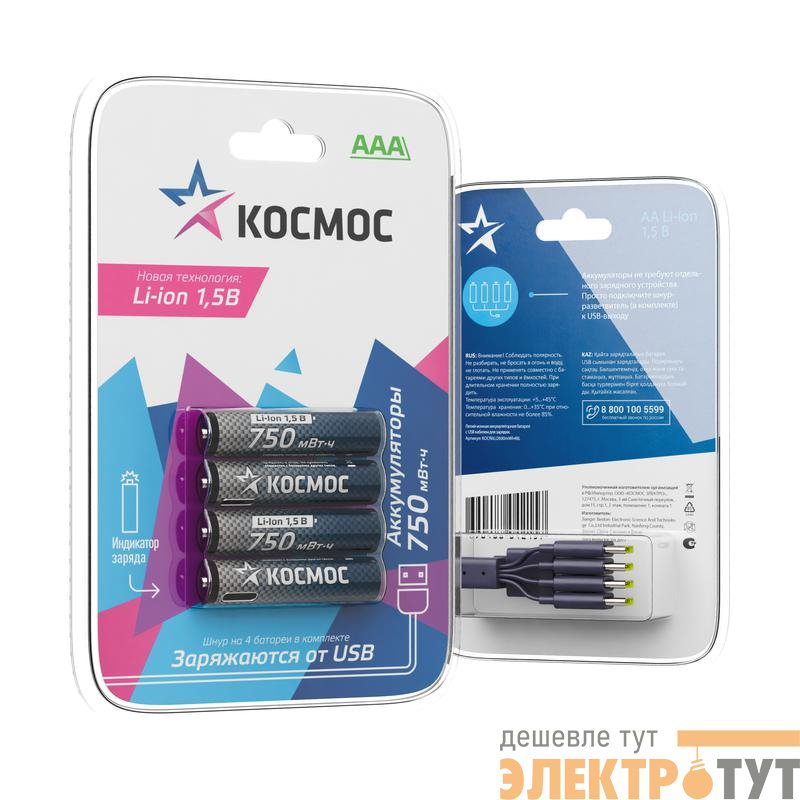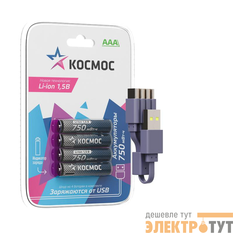 KOCR03Li750mWh4BL | Аккумулятор ААА Li-ion 750мАч (блист.4шт) КОСМОС