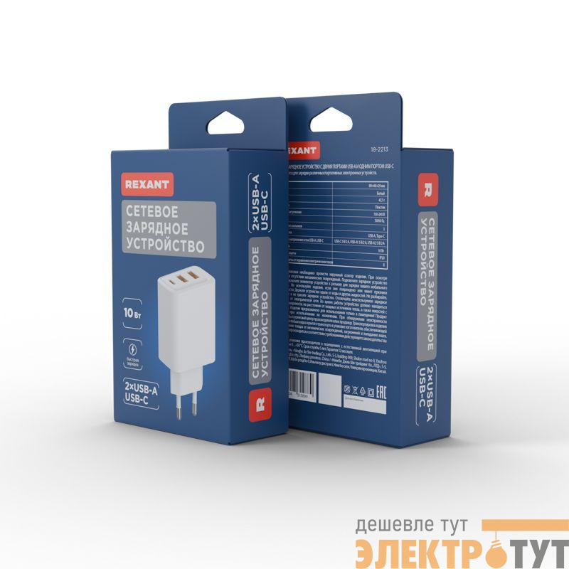 18-2213 | Устройство зарядное сетевое с двумя портами USB-A и одним портом USB-C 10Вт Rexant
