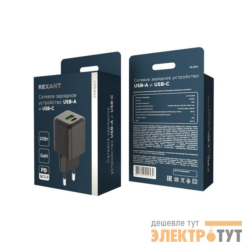 18-2202 | Устройство зарядное сетевое с двумя портами USB-A и USB-C 20Вт GaN Rexant