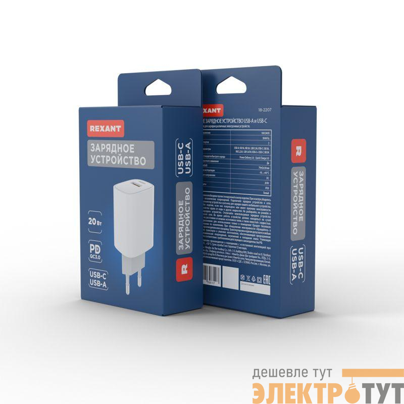 18-2207 | Устройство зарядное сетевое с двумя портами USB-A + USB-C 20Вт Rexant