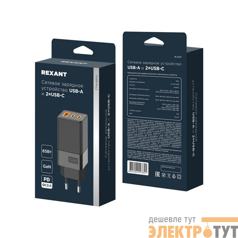 18-2209 | Устройство зарядное сетевое USB-A и 2 USB-C 65Вт Rexant