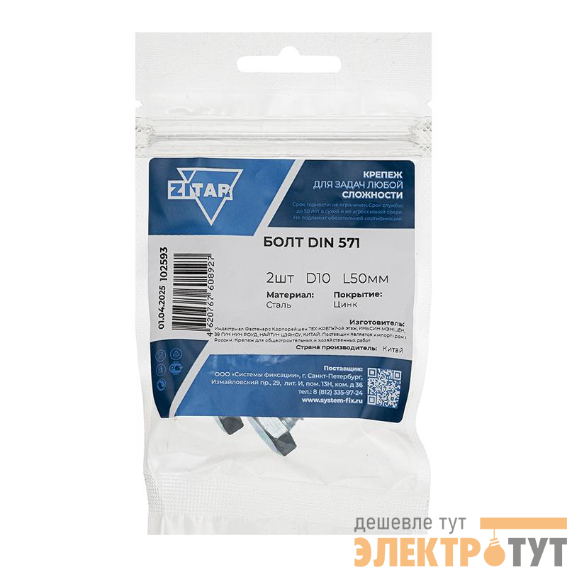 102593 | Болт сантехнический 10х50 DIN 571 оцинк. (уп.2шт) Tech-Krep/Zitar