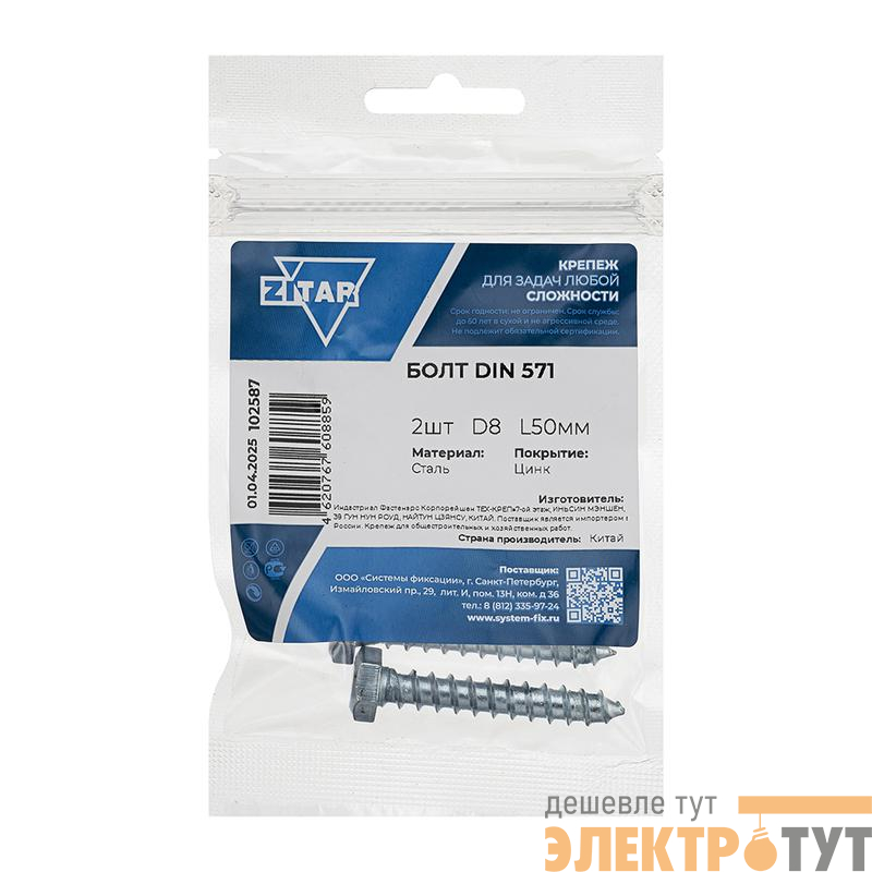 102587 | Болт сантехнический 8х50 DIN 571 оцинк. (уп.2шт) Tech-Krep/Zitar