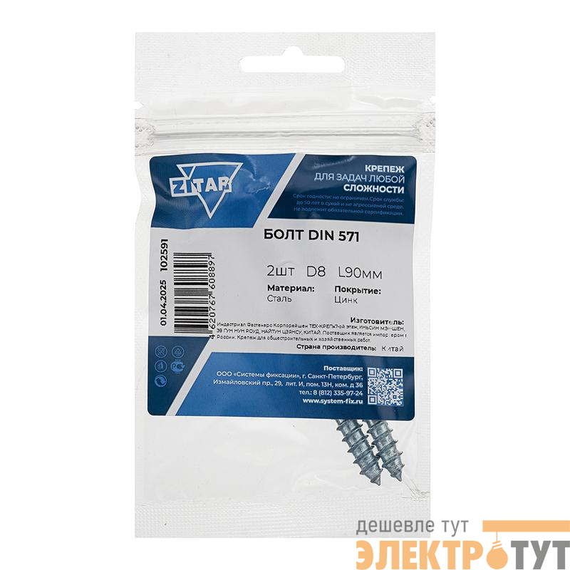 102591 | Болт сантехнический 8х90 DIN 571 оцинк. (уп.2шт) Tech-Krep/Zitar