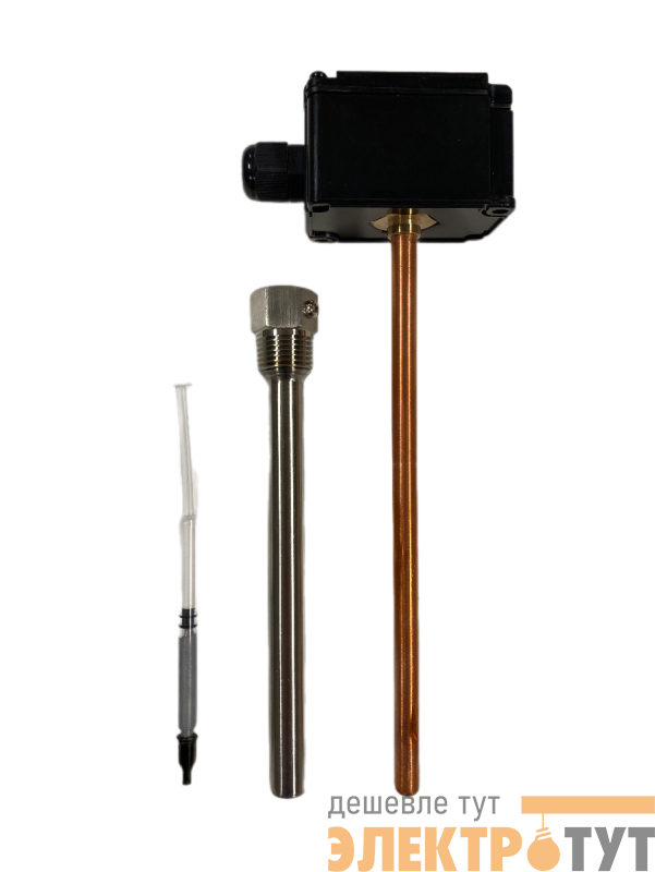 Датчик температуры погружной, диапазон измерения температуры -50…+150°С, выходной сигнал NTC10K, длина погружной части 200 мм, с клеммной головкой, с кабельным вводом, в комплект поставки входит гильза 150 мм, степень защиты корпуса IP65, условия эксплуатации -40…+80°С