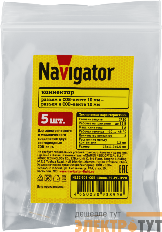 93859 | Коннектор 93 859 NLSC-I03-COB-10mm-PC-PC-IP20 NAVIGATOR
