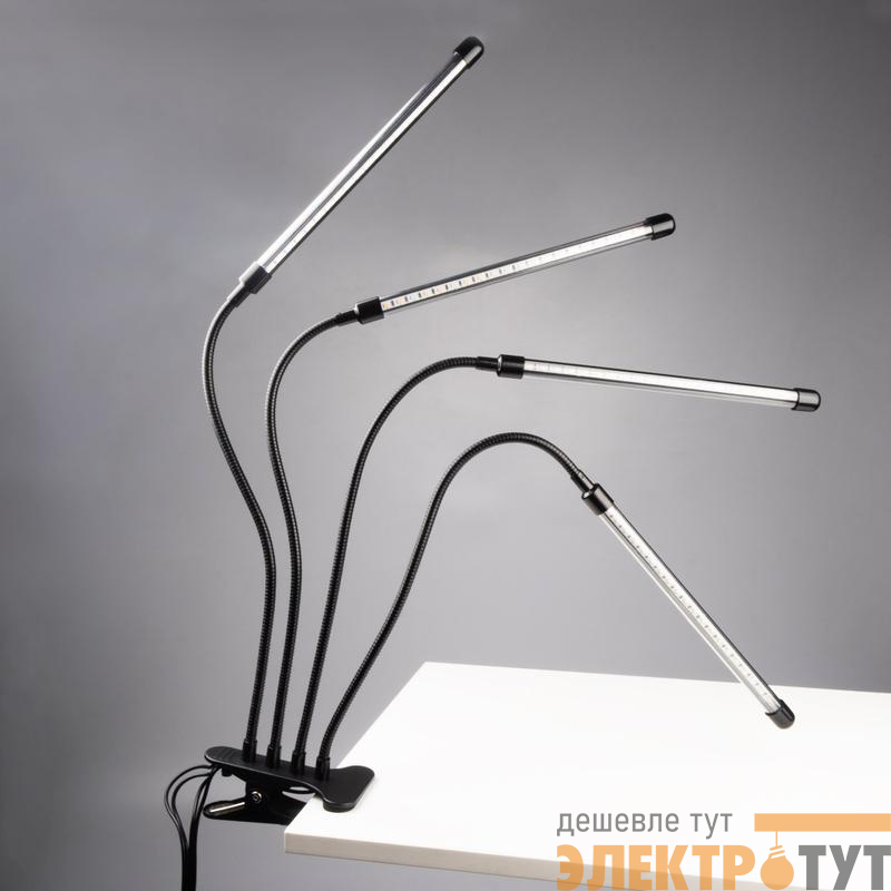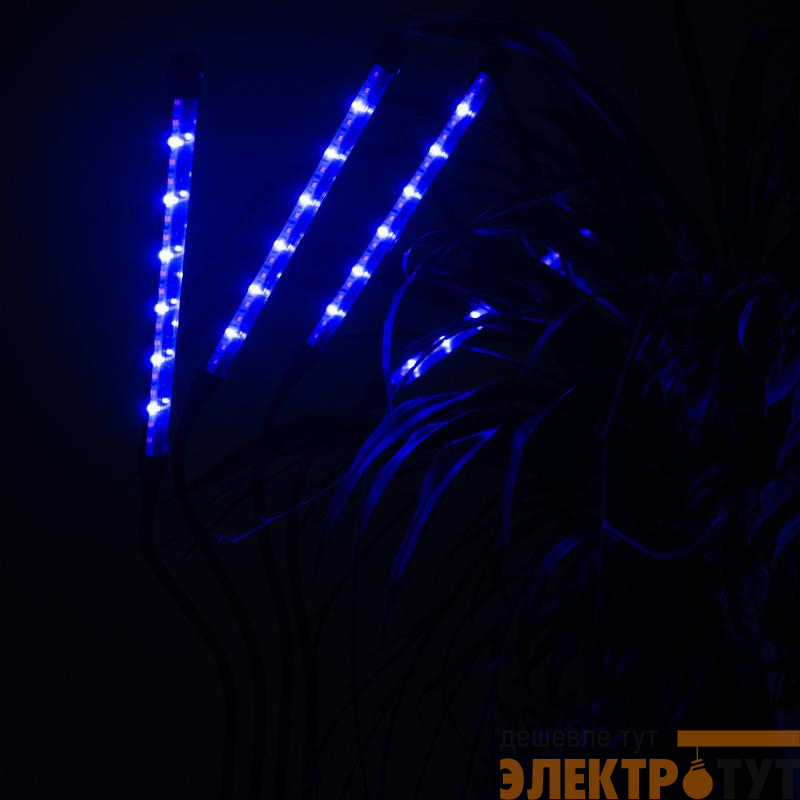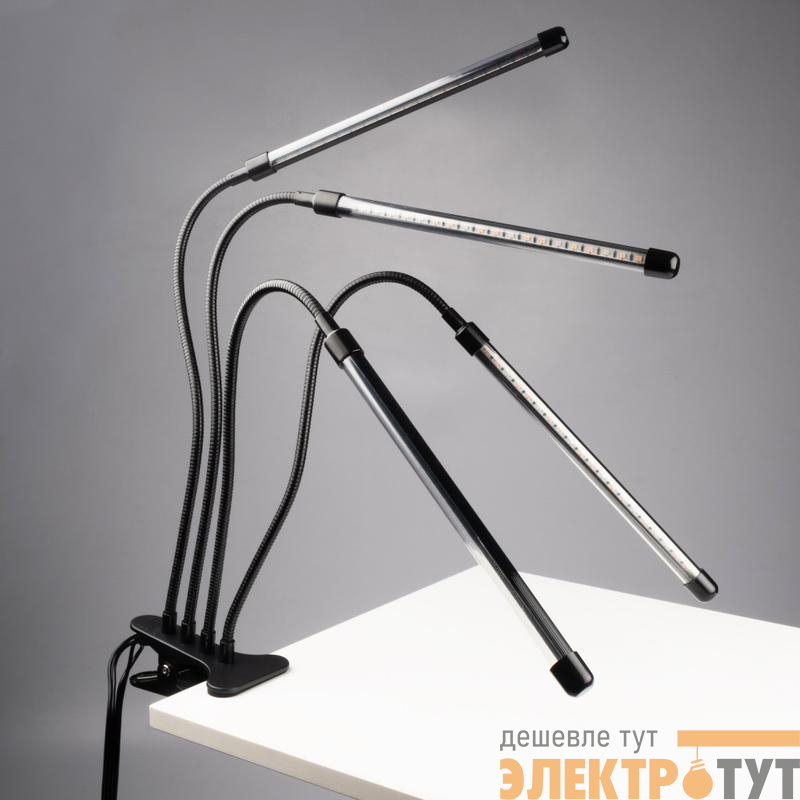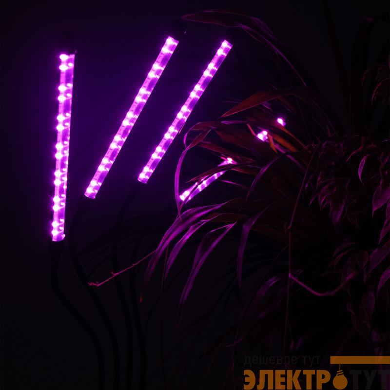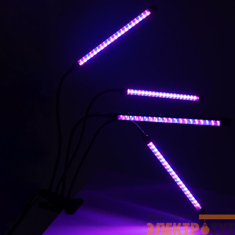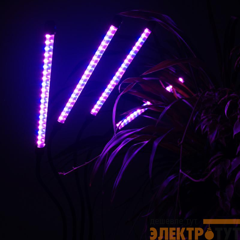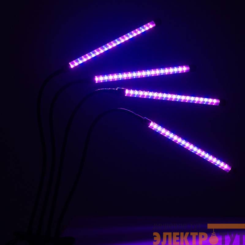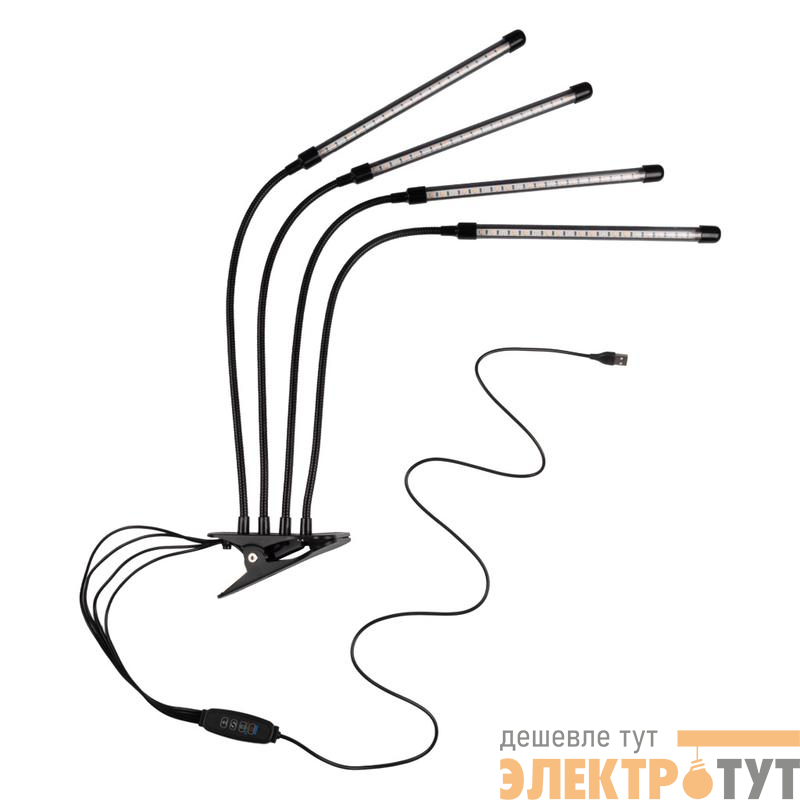 Светильник состоит из четырех отдельных фитоламп на гибких держателях, подключается к сети питания с помощью USB-кабеля со встроенным пультом управления (входит в комплект).