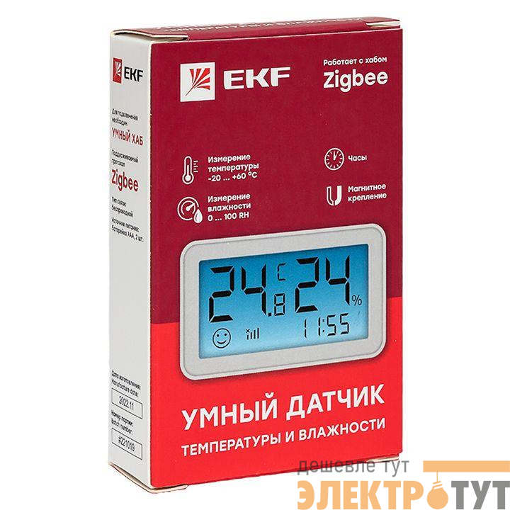 измерения на экране, уведомит вас при критических показателях температуры и влажности с помощью отправки уведомления. Умные датчики можно дистанционно контролировать и управлять ими с помощью мобильного приложения EKF Connect для iOS и Android. Умный датчик поддерживает протокол Zigbee, для подключения нужен хаб.